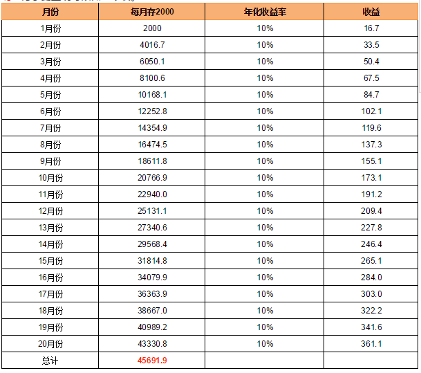 如果每月存2000元,拿这笔钱投资理财年化收益在10%的理财产品,坚持20个月会是什么结果呢?为了更直观可以做一个表。