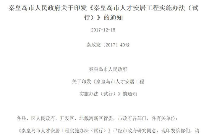 上周,秦皇岛人民政府发布了《秦皇岛市人才安居工程的实施办法(试行)》的通知。