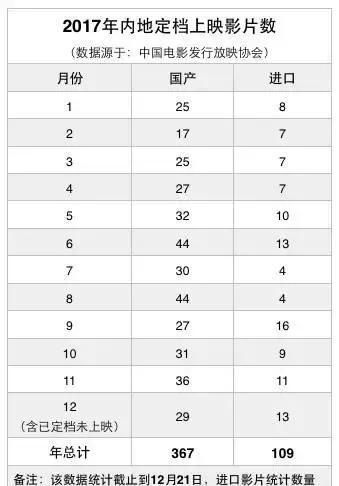 截止到12月21日,根据中国电影发行放映协会的数据(含12月下旬已定档未上映的电影),今年将有476部电影在国内的商业院线上映,只比去年多出十来部。其中,国产电影367部,进口片(分账、批片、港台)109部,今年的总票房预计将在550亿元(含服务费)左右,相比去年457亿的总票房,增长将超过20%。