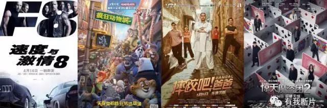 今年进口片分账片票房最高的《速度与激情8》26.7亿,去年《疯狂动物城》15.3亿;今年批片票房最高的《摔跤吧!爸爸》12.99亿,去年《惊天魔大团2》6.38亿。