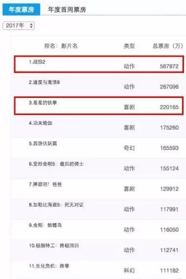 8、《羞羞的铁拳》独孤求败引领国庆档,创造国庆档历史票房最高记录,目前2017年度票房排名第三(仅次于《战狼2》、《速度与激情8》),总榜排名第六。