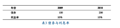 在表3中,对于2010的利息支出,可以用200美元×10%,得 到20美元。尽管假设从1月1日至12月31日的一整年间,债 务余额均维持在200美元,但查看上一年的债务可知,截至 2009年12月31日的债务余额为100美元。十有八九,这额外 的100美元债务不会在第二天就出现在资产负债表中。在没有其他额外信息的情况下,假设债务变动发生于年中。因 此,利息支出是通过100美元与200美元的平均值— (100美 元+200美元)/2= 150美元—乘以 10%的利息率得到的,即 15美元。