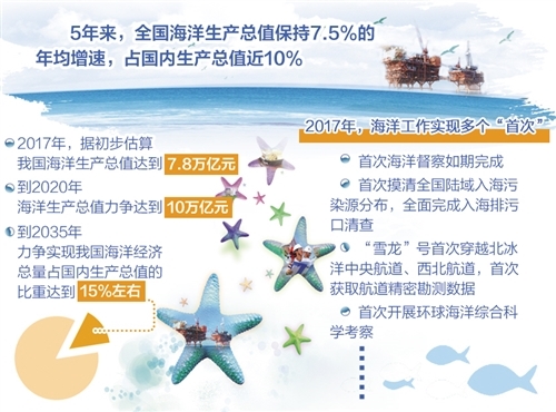 国家海洋局局长王宏表示,在建设海洋强国目标的指引下,2017年海洋工作在许多重要领域和关键环节取得了积极进展。一方面,海洋经济工作成效进一步显现。《全国海洋经济发展“十三五”规划》编制发布,开发性、政策性金融向海洋领域累计投放贷款近1700亿元,沿海各省份共设立各类海洋产业基金3200亿元;另一方面,在极地深海等新疆域实现了诸多“首次”——首次穿越北冰洋中央航道、西北航道,雪鹰飞机首次成功降落南极冰盖最高点,首次开展环球海洋综合科学考察。