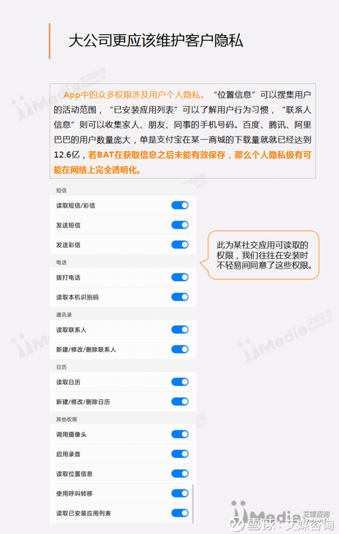 “互联网时代,谈隐私谈何容易”“这么多窃取隐私的app,让我觉得这次数据统计已经不算隐私了”……确实,众多app都尝试着获取用户的隐私信息,如位置信息、通讯录、短信等,商家通过获取、分析用户数据才能更加精准地为客户提供更信息。但是,这些信息背后不仅与企业利润有关,更与用户的生活甚至生命有关。