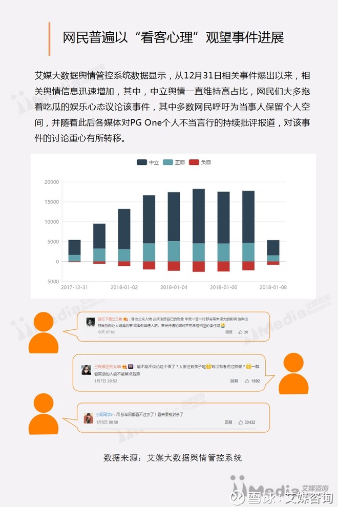 艾媒大数据舆情管控系统数据显示,从12月31日到1月8日,网页和APP平台对该事件的讨论量持续走高,在1月5日至1月6日,各媒体集中对PG One个人进行批评报道及贾乃亮发表微博文章声明后,舆情达到高峰值,7日开始舆情热度下滑。