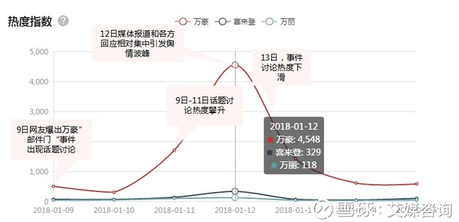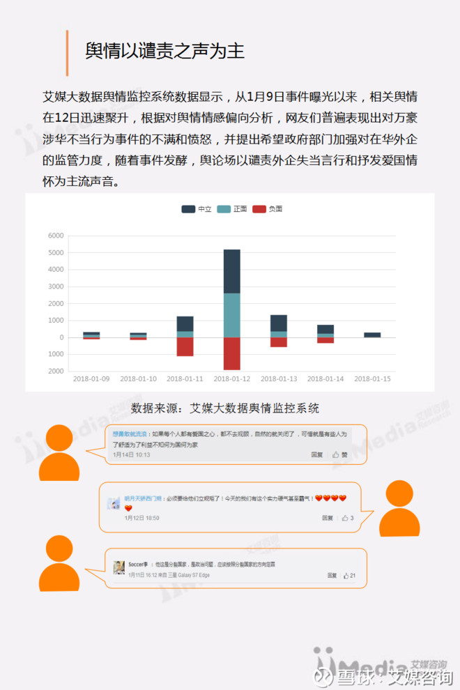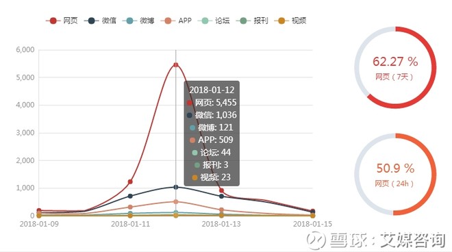 艾媒大数据舆情监控系统数据显示,从1月9日至15日,网页舆论热度随话题热度迅速攀升,并在12日达到最高波峰值5455,微博微信也相应表现出一定的舆情起伏,各平台舆情走势曲线相似,表明舆情热度走势较为均一。