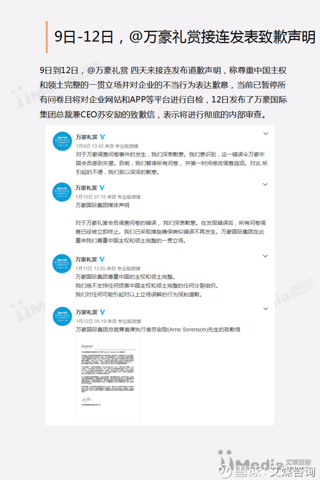 1月9日上午,网友 @仲举扫地 发微博举报万豪酒店集团,称万豪官方在一项调查问卷中,将中国台湾、香港、澳门以及西藏地区与中国大陆并列为“国家”选项,万豪涉华不当行为事件引发舆情热潮,相关部门及企业及时作出回应,此后网友们又陆续扒出有类似行为的外企名单,再次引发民众热议......