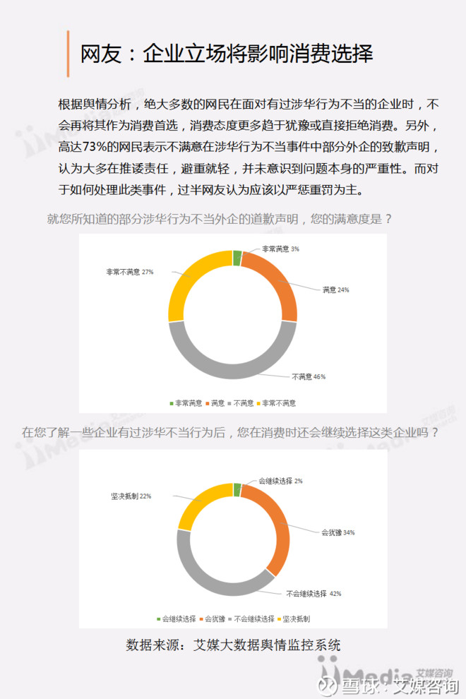 根据舆情分析,在万豪涉华行为不当事件中,网友们表达了对万豪等外企不尊重我国主权和领土完整的失当行为的强烈谴责,而对于万豪发布的致歉声明,不少网民认为万豪在推诿责任且态度不真诚,同时多数网民们也呼吁有关部门依法严惩此类“辱华”事件,杜绝类似事件再次发生。