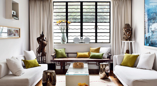 “L”形沙发布置非常适合营造家人间的交流氛围,沙发既可用来坐,也可作为卧榻,如果客人来了坐不下,可以利用零散的圆凳、单人沙发作灵活补充。