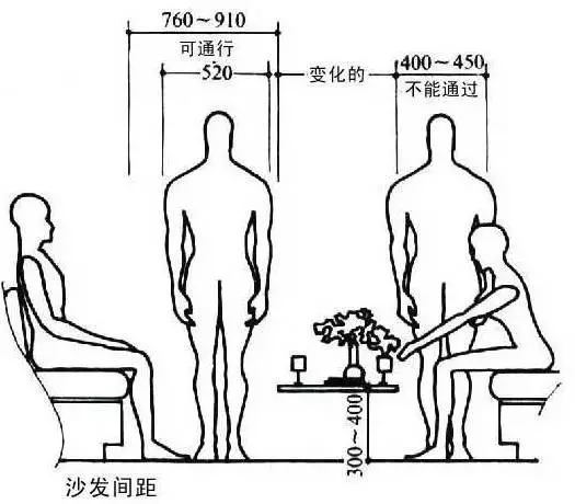 如果沙发呈平行布局,那么当两组沙发相对放置时,尺寸的问题要非常小心。当沙发上坐人时,其他人若能正常通行,那么茶几与沙发较为适宜的距离为760-910mm。