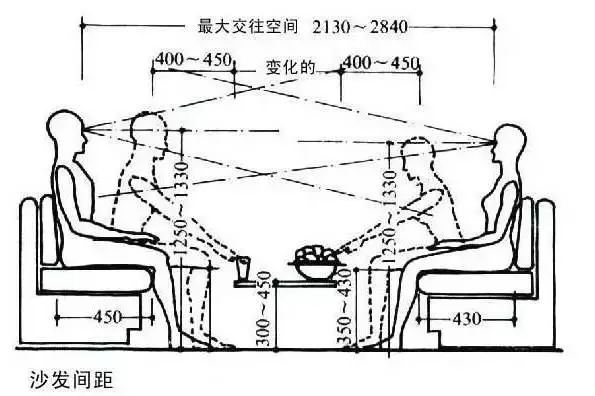 当两个人对立而坐时,二人的最大交往空间为2130-2840mm。