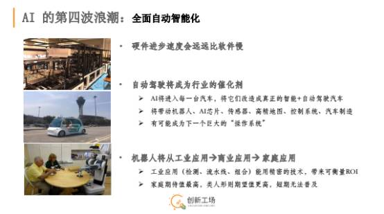 他认为,全面自动化一定会从两件事情开始,第一是无人驾驶,未来十几年会成为主流;第二是工业自动化,很多流水线的人工作是重复性的,可被机器取代。