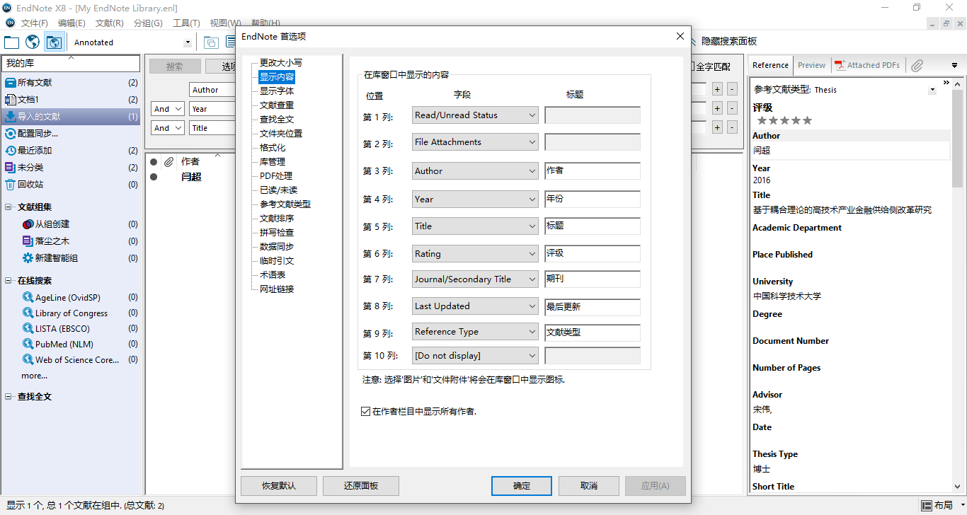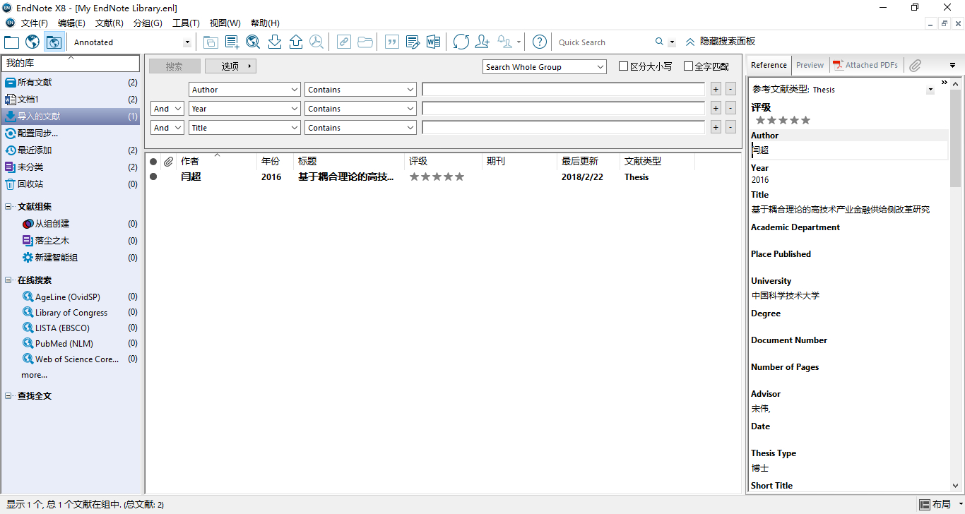 EndNote 有着易用的界面和强大的文献搜索功能,对中文也支持良好,是科研工作者不可多得的好助手,无论是文献的检索、管理、文献全文的自动获取,还是论文写作过程中的文献引用插入、SCI 期刊模板等方面,均可为用户提供强大帮助。有数以百万计的研究人员、学生和图书管理员使用,它能方便地扩展任何语言参考书目,允许你创建任意大小的文献库。通过EndNote可进行文献批量下载和管理、写作论文时添加索引、分析某篇文献的引文索引、分析某领域或者学术课题的经典文献地位等。