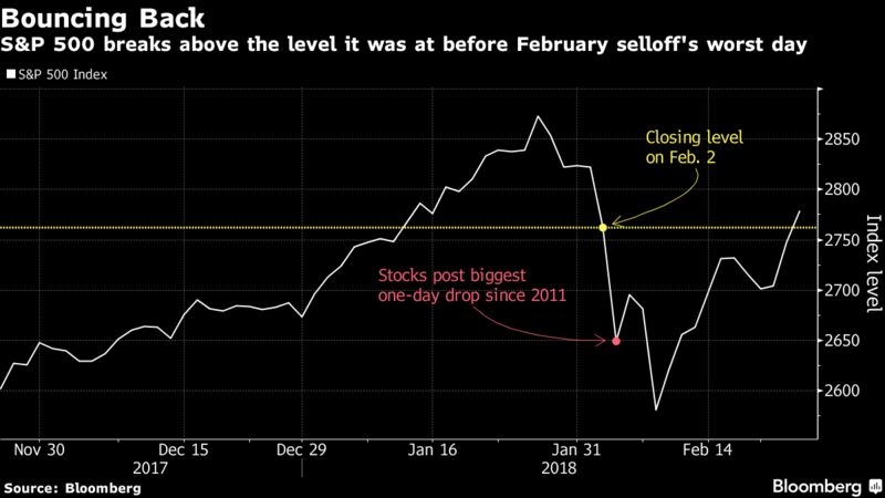 Shares rose from Tokyo to Sydney after the S&P 500 recovered most of the losses emanating from the slump that hit global stock markets at the start of the month. The MSCI Asia Pacific Index of stocks also recouped almost all of February’s losses. The 10-year Treasury yield was steady after falling to a two-week low as investors await the first public comments from Federal Reserve Chairman Jerome Powell on Tuesday. Oil was steady after its recent rebound.