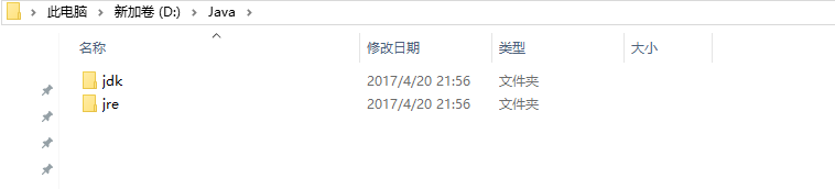 注意:最好不要选择源安装目录,因为你发现Program Files中间含有空格,以后编译java软件可能会发生错误,一时半会都找不到问题出在哪里,所以防患于未然,这里建议安装到其他目录上面。我个人是选择在D盘新建一个文件给他叫做Java,打开Java文件夹,在里面新建两个文件夹,一个叫jdk,一个叫jre.