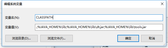 15.新建系统变量CLASSPATH,变量值填 .;%JAVA_HOME%\lib;%JAVA_HOME%\lib\dt.jar;%JAVA_HOME%\lib\tools.jar(注意这个变量值前面还有一个点,代表从当前路径)