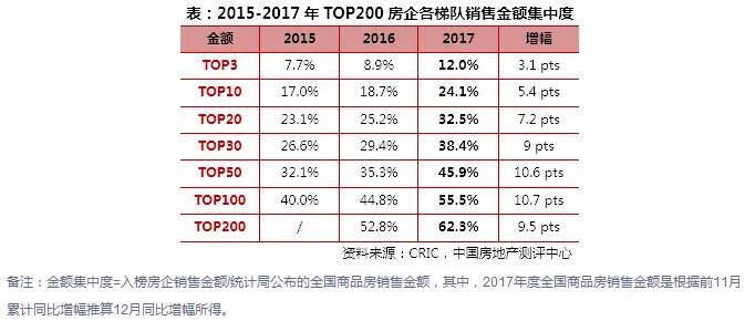 克而瑞数据显示,2017年,随着品牌房企业绩规模的增长,TOP200房企各梯队集中度均有较大幅度的提升。其中,TOP10房企集中度达24.1%,TOP30房企集中度近40%,TOP50房企集中度提升幅度较大,提升近10.6个百分点至45.9%。而TOP100房企集中度达55.5%。