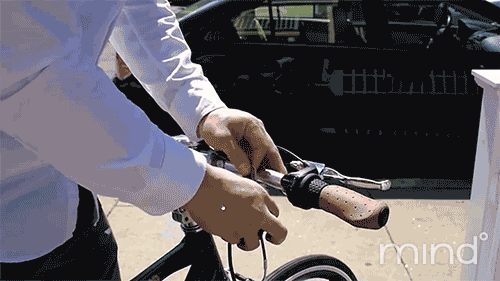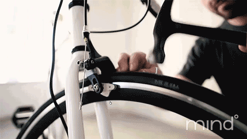 打开 eoOrbital Wheel 的快拆装置,对准单车的前叉,将 GeoOrbital Wheel 放置进去,并且锁上快拆,用魔术带将 GeoOrbital Wheel 与前叉进行固定。。。