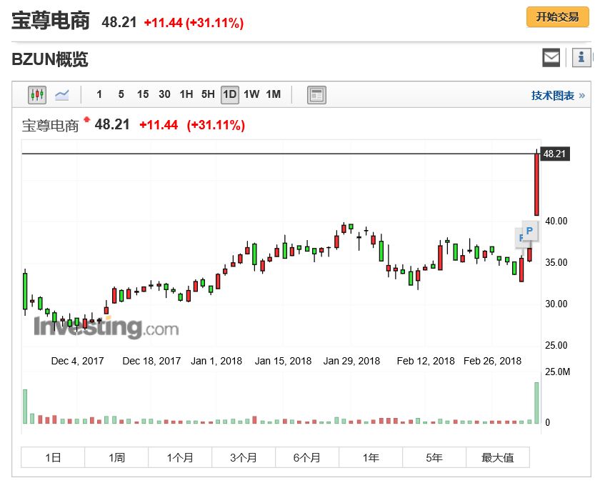 摘要:在周二的美股盘中,中概股宝尊电商 (NASDAQ:BZUN)成为了市场中最博眼球的一只个股,高达31.11%的日涨幅,在近日持续低迷的美股市场中表现尤为突出。公司2017年全年实现了161.47%的涨幅,而2018年至今的短短几个月中,股价亦上涨超过50%.