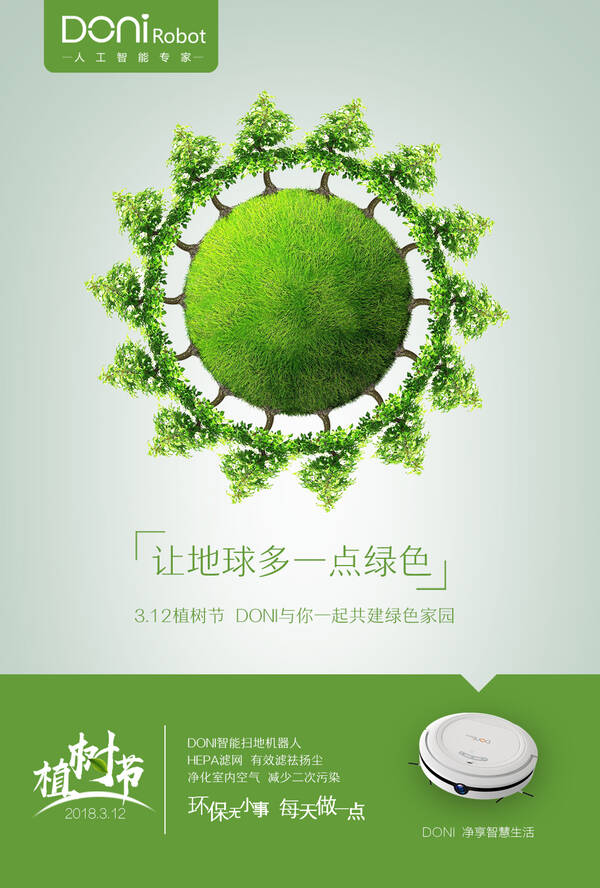 在植树节之际,DONI扫地机器人和你一起共建绿色家园,种下一个希望,给大自然多一份呵护,给地球增添一点绿色,为我们的生存环境增添色彩。