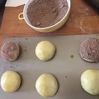 8. 拍扁排气 重新收圆 刷上蛋液 手捏底部 在可可酥粒粒晃荡一圈 34度 75湿度 发酵40分钟