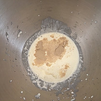 3. 淡奶油 菌液(没有可用水替代)牛奶(因为每个人烫出的卡仕达酱浓稠程度不一 可以先加10G左右 根据面团状态加入 我的卡仕达一般都烫比较浓稠 所以我加了20G的牛奶) 撒入酵母粉 静置分解5分钟