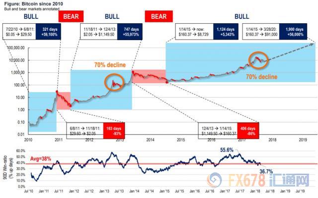 Fundstrat Global Advisors的管理合伙人汤姆·李(Tom Lee)在给客户的一份声明中写道,即使比特币的价格从2017年12月的历史高点下跌了70%,在2018年初下跌了40%之后,看起来这一数字货币将难成气候,但从长远看,比特币这一第一大数字货币仍处于牛市阶段。他将70%的跌幅与2013年中期的跌势进行了对比,当时比特币价格在暴跌之后展开了700多天的反弹,涨幅超过55000%。如果他的图表是正确的,那么至2020年,比特币的价格将达到91000美元。