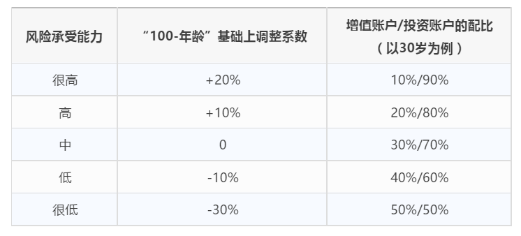 用100减去实际年龄,得到的数字就是投机账户的初始占比;然后根据风险承受能力,按照下面表格调整得出的数字,调整投机账户的占比,得出应分配到投机账户里的钱。风险承受能力的测试可以上度娘搜索测试啊。
