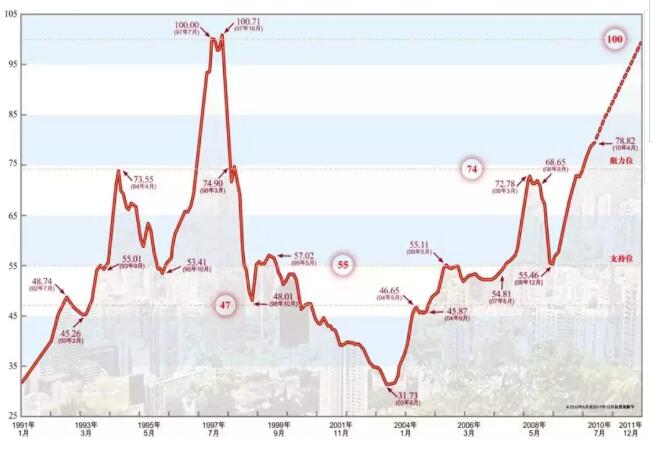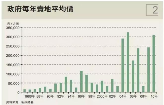 由于香港土地供应长期短缺,这就令每次的地价波动带来的价格越来越高,每次的谷底都会比前次的高峰更高。