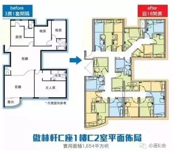 ▲香港傲林轩一间150平米的三居,被劏成了18间带厕所的套房,每间租金约为8000港币。