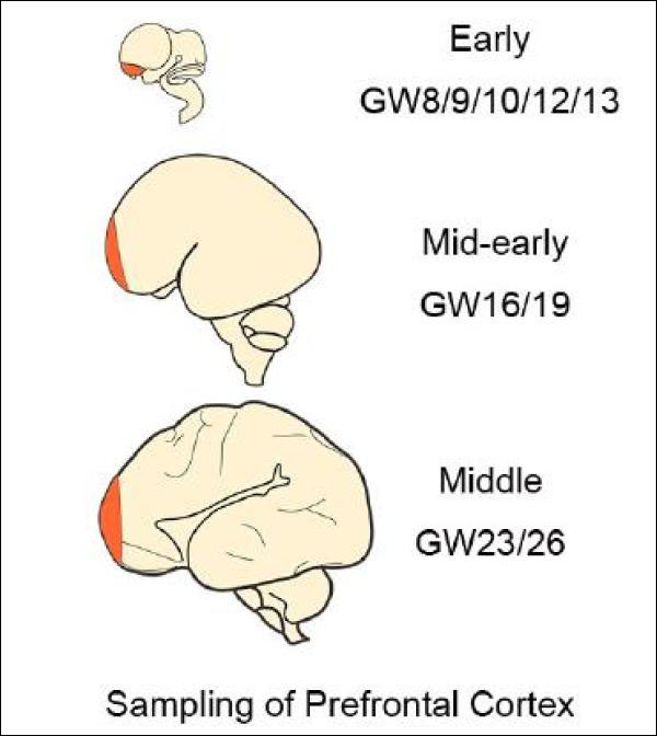 第一个阶段,也就是8-12孕周,为神经干细胞大量增殖阶段。第二阶段, 13-16孕周,神经干细胞分化并大量产生新生神经元同时伴随着新生神经元的迁移阶段。第三阶段,19-26周,神经元开始逐渐成熟,表达关键功能蛋白并初步形成有功能的神经网络的阶段。