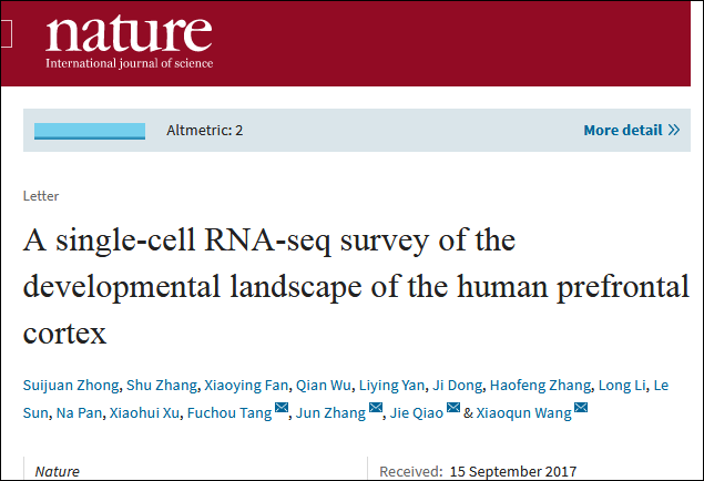 据澎湃新闻网3月15日报道,北京时间3月15日凌晨,顶级学术期刊《自然》(Nature)在线发表文章“A single-cell RNA-seq survey of the developmental landscape of the human prefrontal cortex”(关于人前额皮层发育状况的单细胞RNA测序研究)。