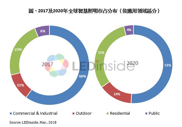 在政府帶頭推廣下,智慧照明的社會接受度提高。智慧照明具備節能、便利、易於控管等優點,而物聯網的崛起也讓企業有導入聯網照明的必要性,因此在商用與工業用照明市場中,智慧照明需求快速成長。LEDinside數據顯示,2017年工業及商業照明已占全球智慧照明市場規模的60%。在數位化發展下,智慧照明將為這兩個領域帶來更多新的商業模式和價值提升。