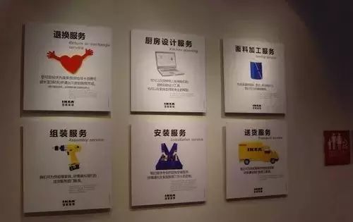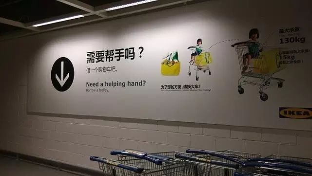 此外,在宜家里,指示清晰明了的指引牌随处可见,墙上、地上、各种货架上,甚至连购物车都会有清晰的退换货指示牌。