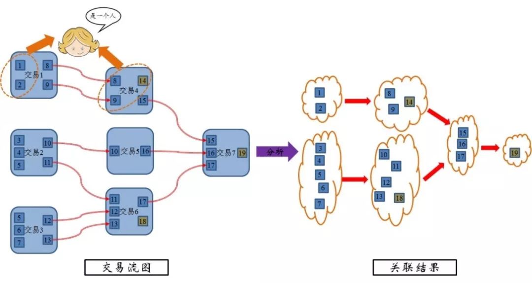 最常用的一个思路是对公开的交易账本信息进行资金流分析。区块链账本的每一条账单都记录了某一笔资金的转移情况,最简单的交易只涉及两个代号:一个提供者和一个接收者。