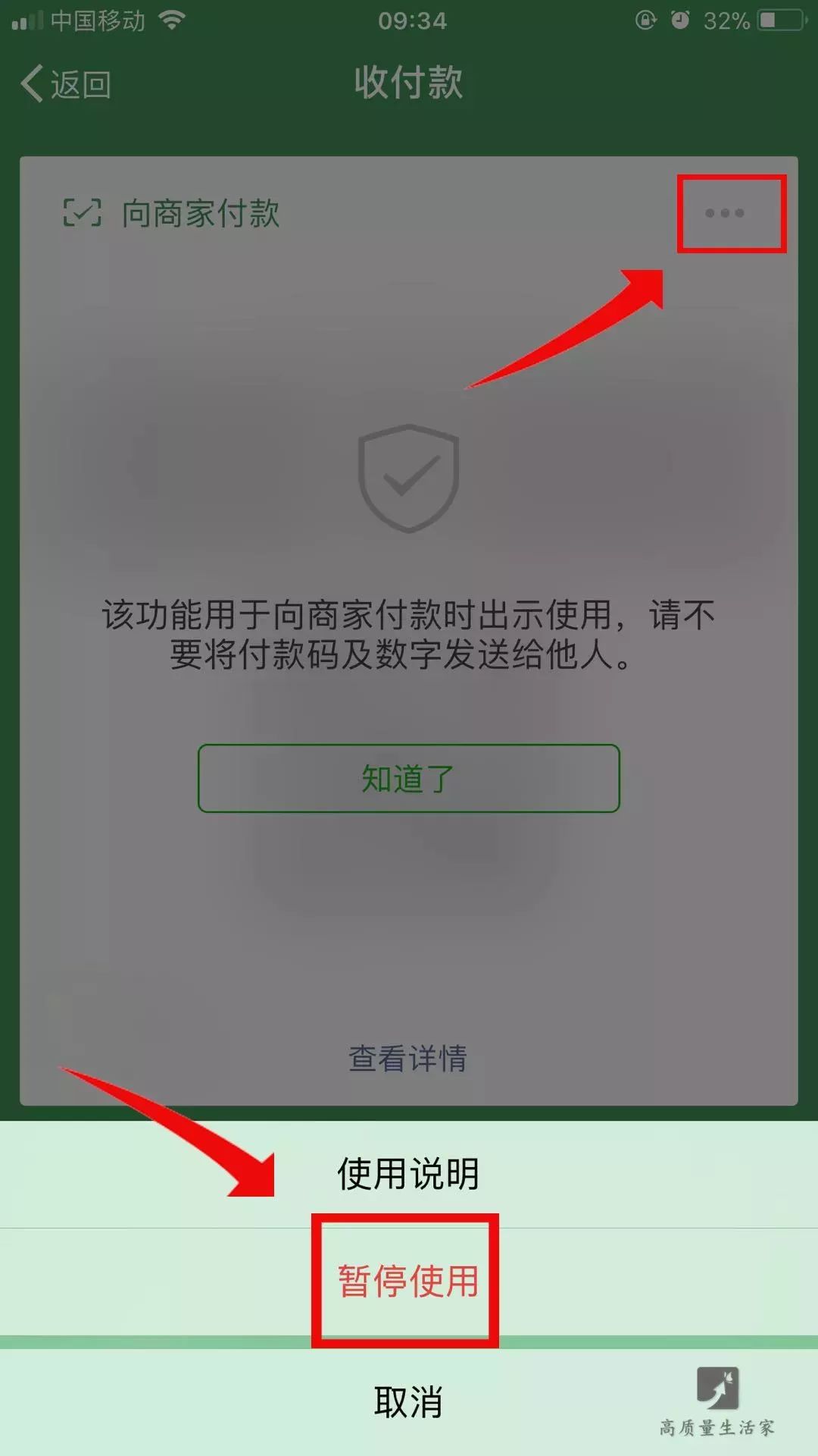 进入收付款后,点击右上角的小三点即会有【 暂停使用 】的选项出现,点击即可。