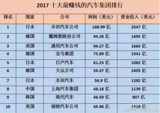 汽车前十名,美国有两家通用和福特,分别排第3和第10。中国只有一家上汽,排第8名。美国两家公司的总营收几乎是上汽的3倍。