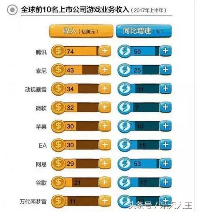 全球前十名,美国有五家,总业绩147亿美元,中国只两家腾讯和网易,总业绩103亿美元,美国胜。