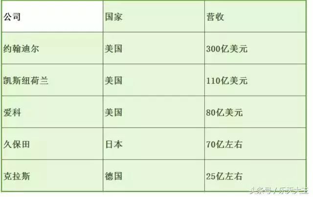 农用机械是美国的天下,全球前三名全是美国的。第一名迪尔营收超300亿美 元,其中农机业务8成。中国做得好的农机企业一拖和雷沃只有十几亿美元,不到迪尔的十分之一。