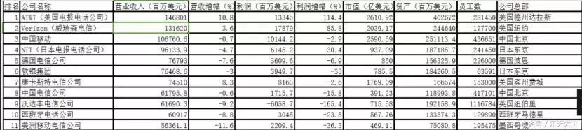 世界10大电信运营商,有三家是美国,而且前两名都是美国的,中国有两家上榜,就是中国移动和电信,排第三第八,第一名美国AT&T公司,华为手机当初就是和它合作,想打入美国市场,后来被美国政府给否决了。这块美国强。