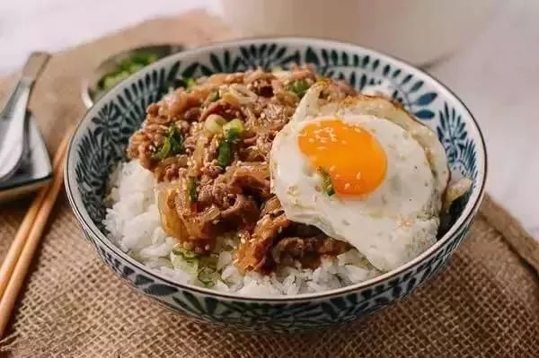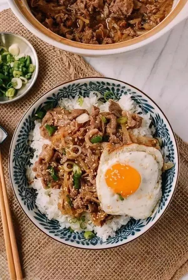 材料:菜籽油、2个中等洋葱,切成薄片、半斤牛肉薄片、2茶匙糖、2汤匙料酒、2大汤匙酱油、1杯鱼汤(鸡汤也可以)、4个鸡蛋、葱段、2茶匙烤芝麻(可选)