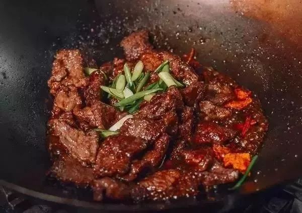 4、用橘皮和调料爆锅,加入牛肉快速翻炒,再加入酱油和红糖,最后放淀粉液收汁撒上葱段就完成啦