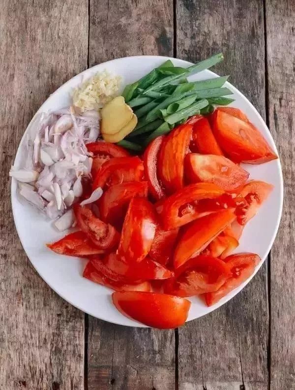 材料: 一斤牛腩,切成5厘米左右厚片、牛肉腌料(1大汤匙玉米淀粉、1茶匙油、¼茶匙盐)、番茄酱2汤匙、2汤匙淡酱油、1½茶匙糖、½茶匙芝麻油、白胡椒粉、3汤匙油、2薄片鲜姜、1瓣大蒜,切碎、葱少许,切片、大葱少许、4到5个大西红柿、1大汤匙绍兴酒、½汤匙生粉。