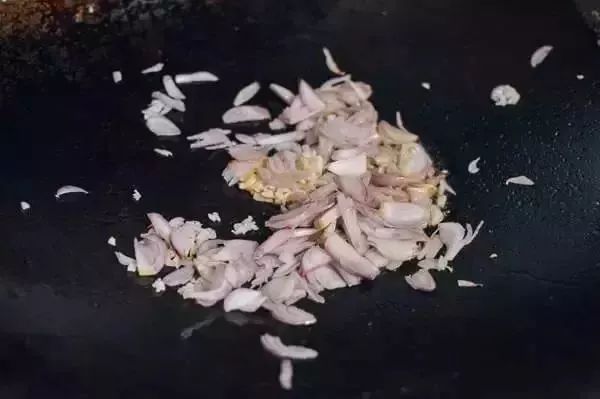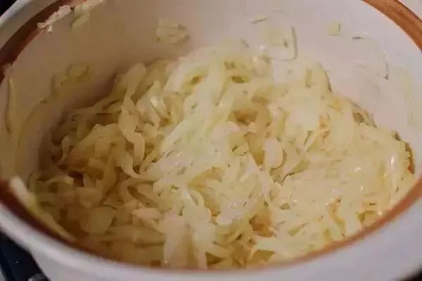 2、用热油煮熟洋葱丝,加入牛肉薄片和盐。