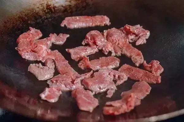 5、锅内沸腾后迅速加入牛肉,翻炒使肉片分离,仍然用大火,牛肉差不多都变色都可以关火了,要不然就不嫩了哦