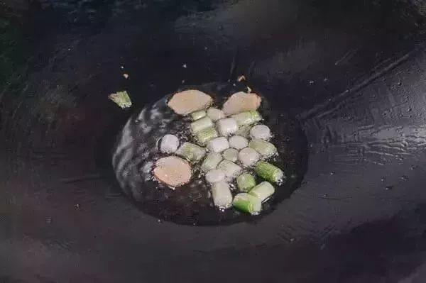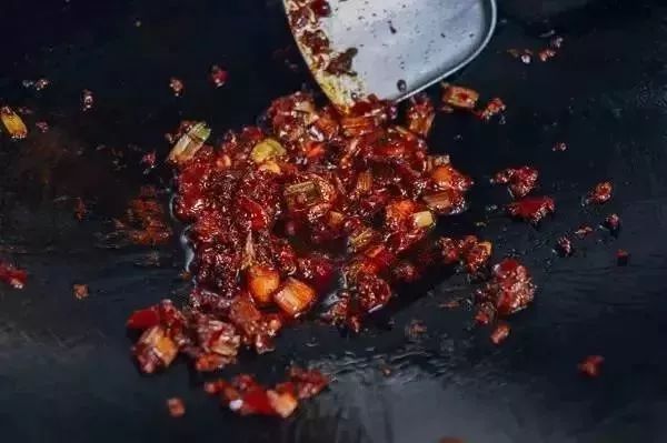 4、热油爆葱和姜,等葱有点焦了,加入辣椒酱和花椒。翻炒至油色变亮,加入糖和鸡汤,调至大火,搅拌。