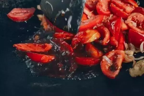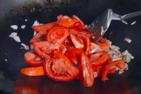 3、用热油爆香洋葱和蒜,然后加入番茄块继续翻炒。