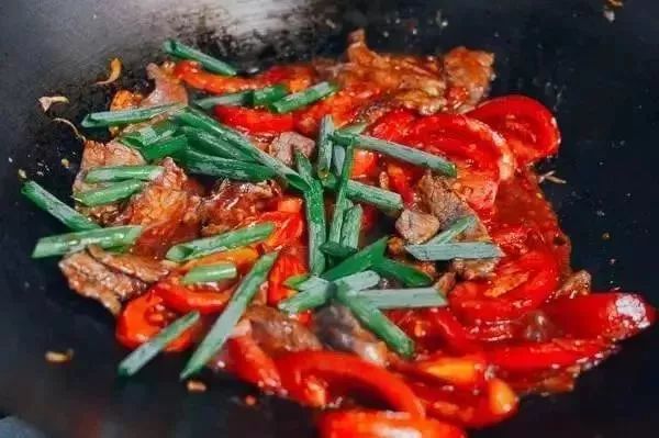 4、加入牛肉和酱料,略加翻炒后加入淀粉液,收汁,再撒上葱段就完成啦~