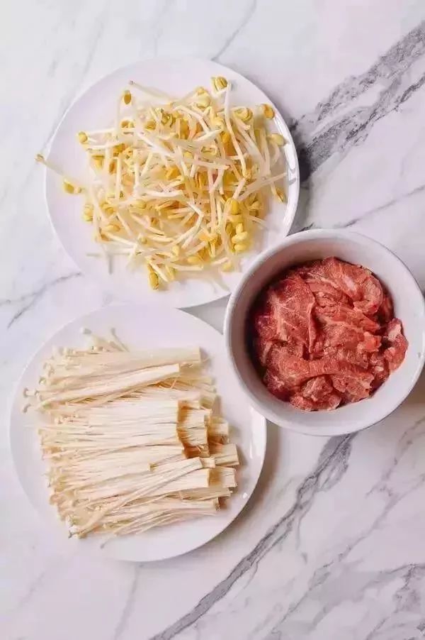 2、将豆芽和金针菇洗净备用,处理牛肉。