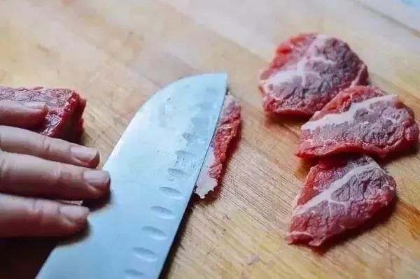1、将牛肉切成片,不要太厚也不要太薄,厚度大约五厘米左右为宜。牛肉纤维比较粗,切得时候要逆着纹理切,切完后可以拿刀压一下,让肉质松散一些~